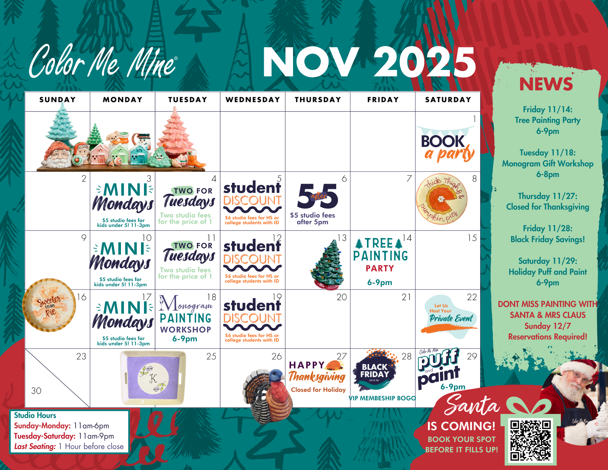 🎅🏻 BONUS: Paint with Santa is NEARLY HERE! Don’t wait to book for THE holiday event of the season, happening Sunday December 7th! Reservations Required